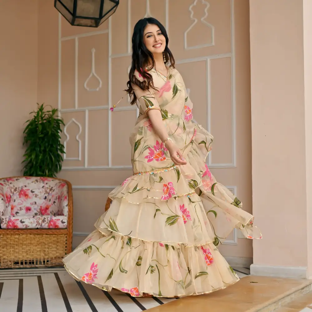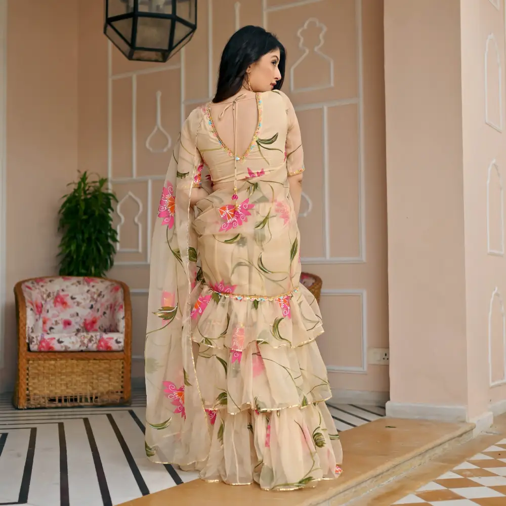 Elegance meets exuberance in our Almond Draped Saree With Blouse, a creation that’s as timeless as it is tantalising. Picture yourself draped in the softest beige organza, gracefully swaying like a leaf in the wind. Hand-painted flowers and cascading ruffles add a touch of artistic flair and playfulness, making this ensemble a masterpiece of style and substance.